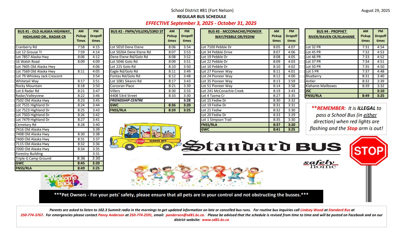 For routine bus inquiries call Lindsey Wood at Standard Bus at 250-774-3767.